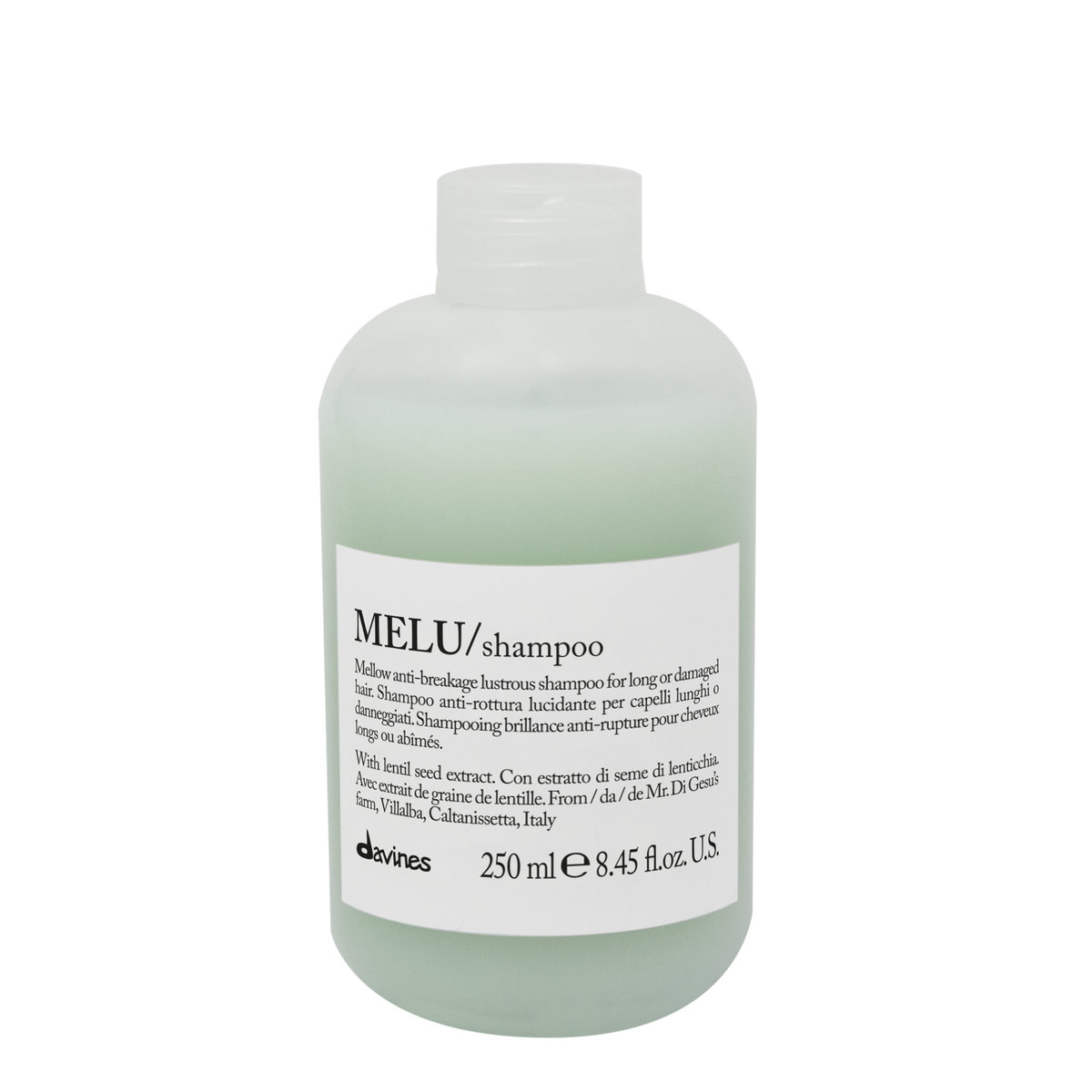 Davines Melu Shampoo paikkaa vaurioituneita hiuksia ja vahvistaa vaurioituneita ja pitkiä hiuksia. MELU Shampoo tukee pitkien hiusten hyvinvointia ja elinvoimaa, se sisältää runsaasti hiuksia vahvistavia proteiineja ja hiusten katkeilu vähenee. Kermainen vaahto puhdistaa hiukset hellävaraisesti. Jos olet aikeissa kasvattaa hiuksiin lisää pituutta, ota avuksi Melu-tuotteet! Davines Melu Shampoo sisältää Sisiliassa pientilalla viljeltyä linssiä, jonka keratiinit ja aminohapot rakennepaikkaavat ja vahvistavat hiusta.
