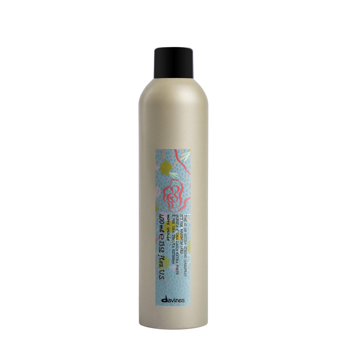 Davines Extra Strong Hairspray Tämä erittäin voimakas hiuslakka sopii painovoimaa uhmaavaan viimeistelyyn. Valitse Extra Strong Hairspray sellaisiin kampauksiin, jotka eivät kaipaa lainkaan liikettä, kuten näyttäviin nutturoihin ja ponnareista leijailevien irtohiusten suitsimiseen.